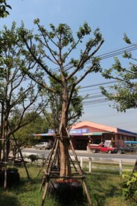 มั่งมี เป็นไม้ยืนต้นมงคล ไม่ผลัดใบ ให้ร่มเงาดีเหมาะปลูกเป็นไม้ประธานหน้าบ้านหรืออาคาร ให้ความสง่างาม ดูแลง่าย ทนร้อน ปลูกได้ในที่แดดจัด